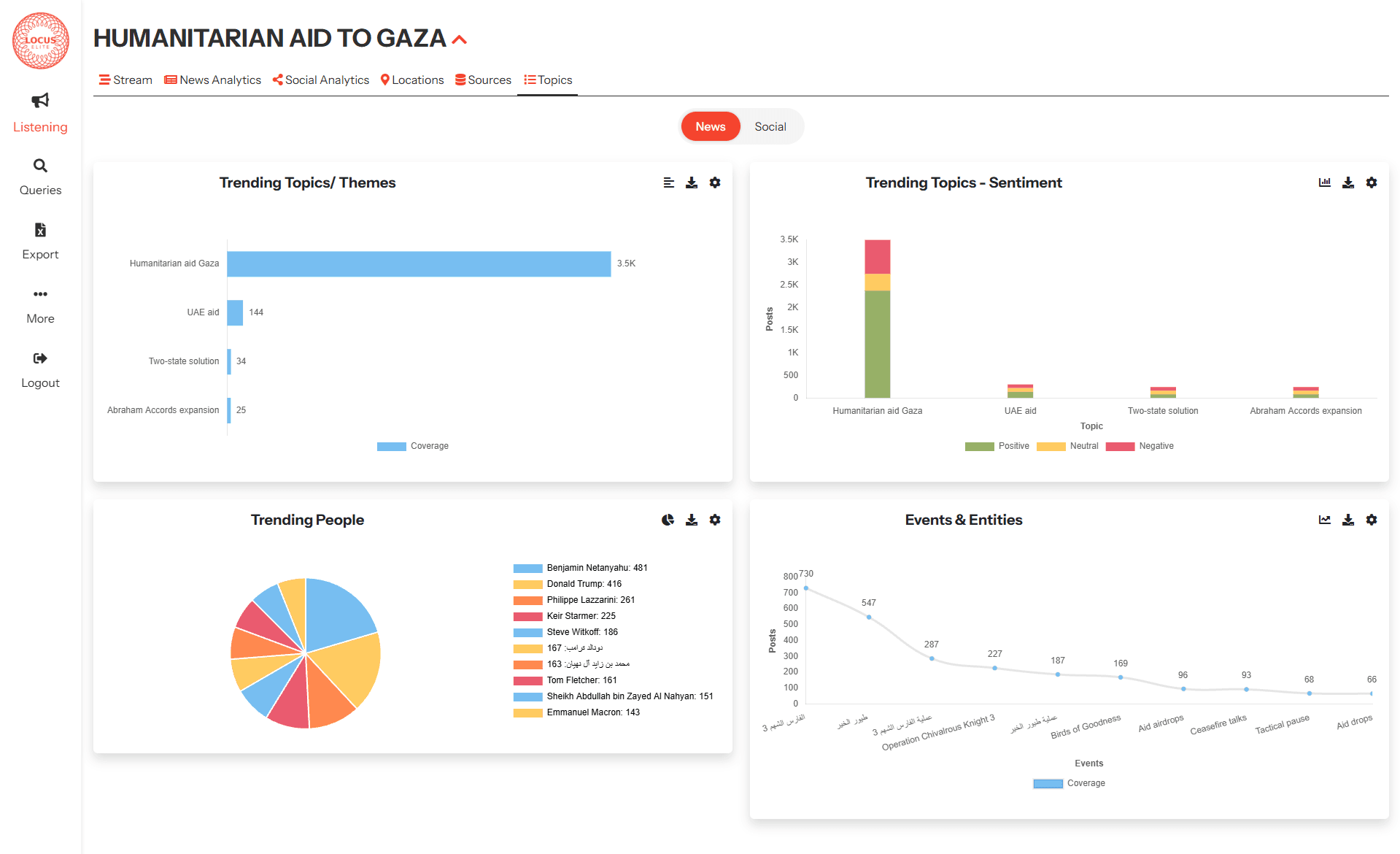 Stay on top of global news, broadcast, and social media in one dashboard, with queries, filters, and realtime alerts keeping you informed.