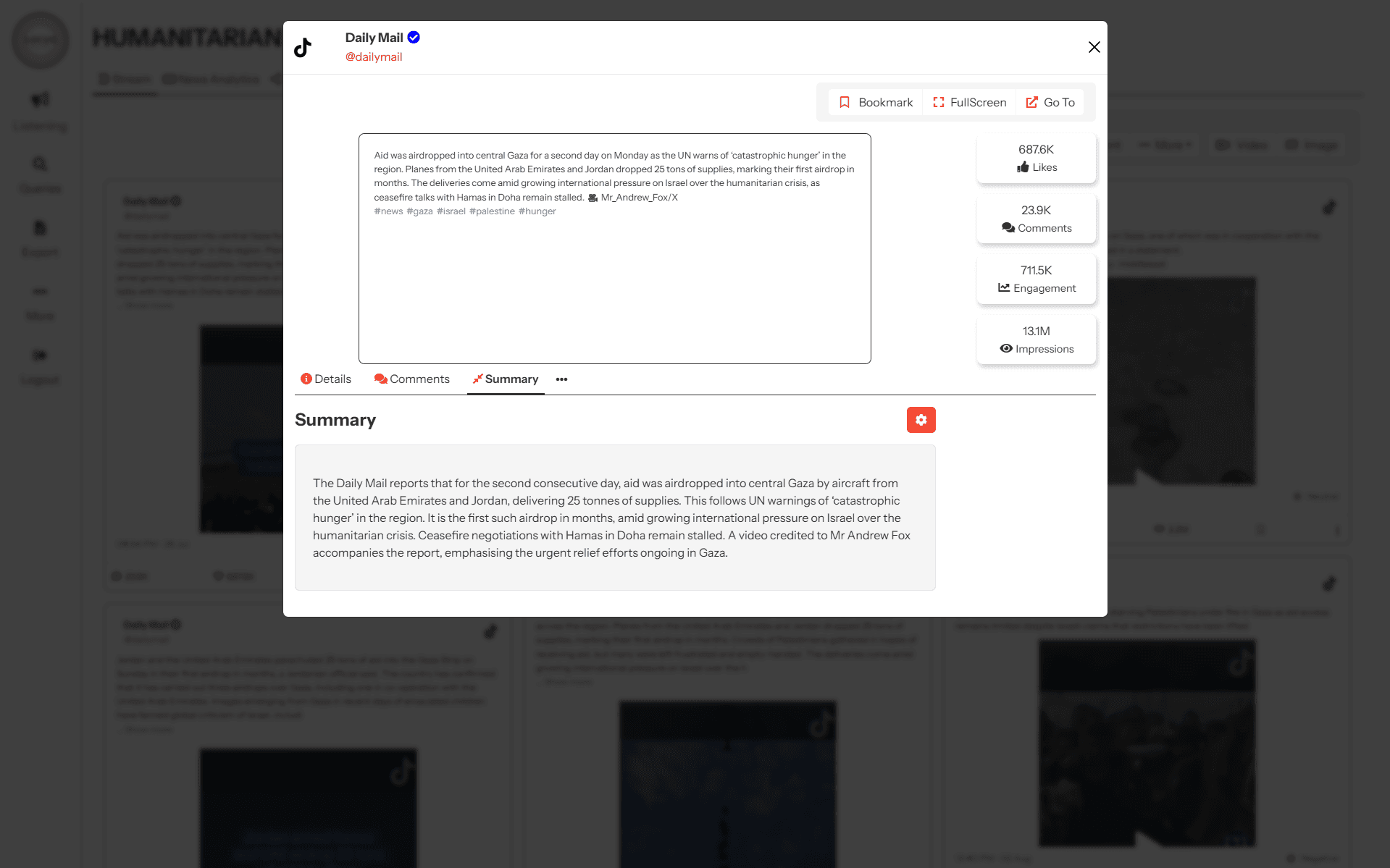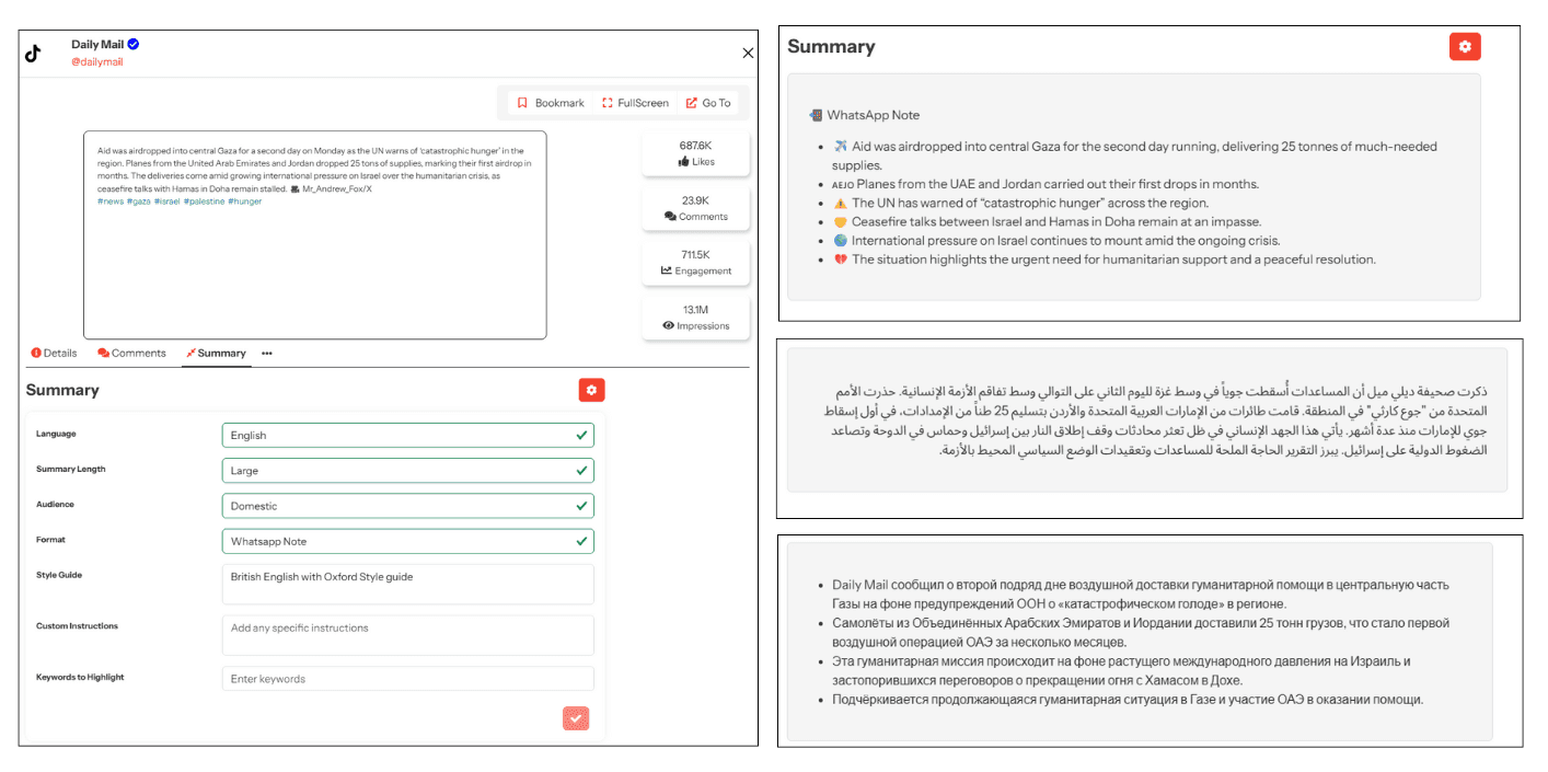 In the Summary tab, condense long articles or posts into short briefs that highlight the key people, institutions, and regions involved.