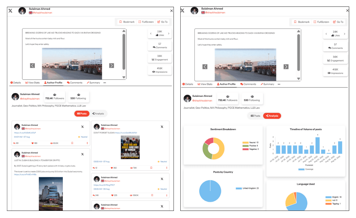 The Author Profile view lets you evaluate reach, credibility, and posting history. See previous posts with analysis, and detect potential threats to your organization from specific authors or media outlets.