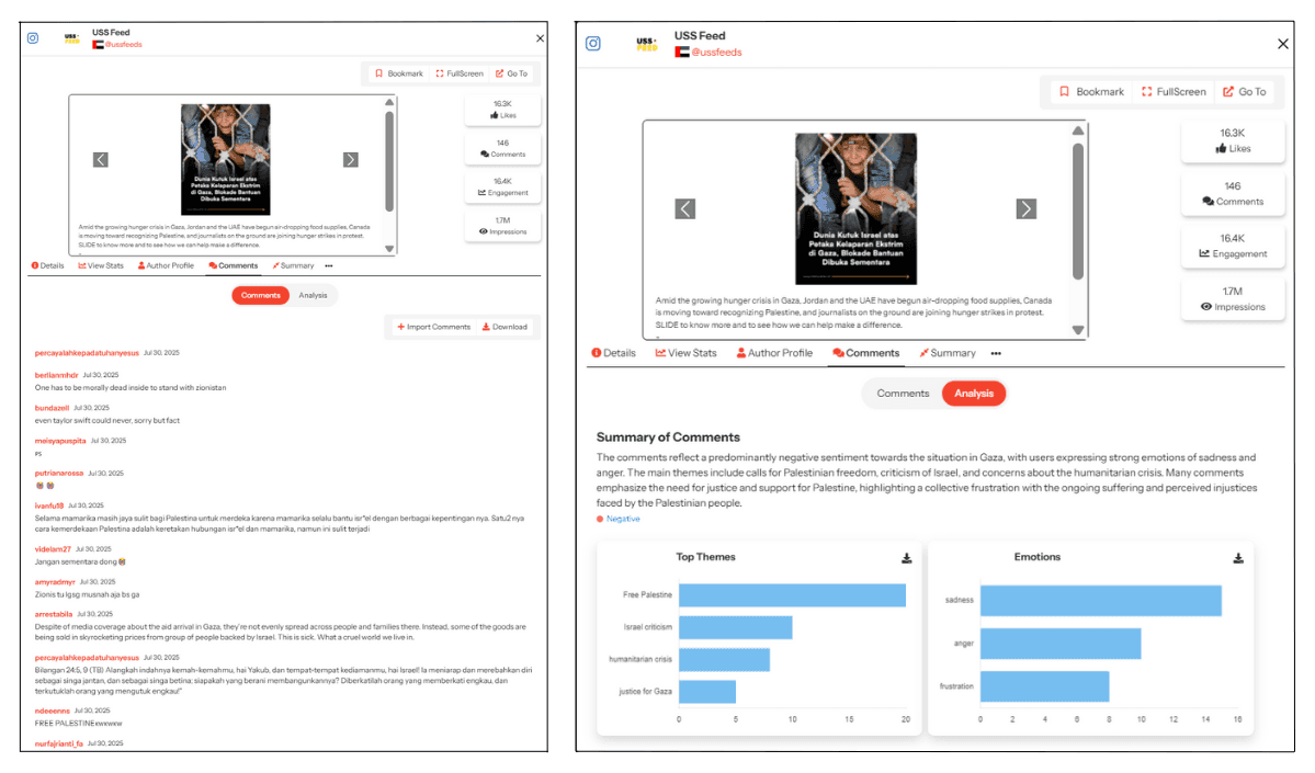 The Sentiment tab on each post card shows tone across articles, posts, and entities. Track percentages like anger, support, or criticism β and adjust overall sentiment manually if required.