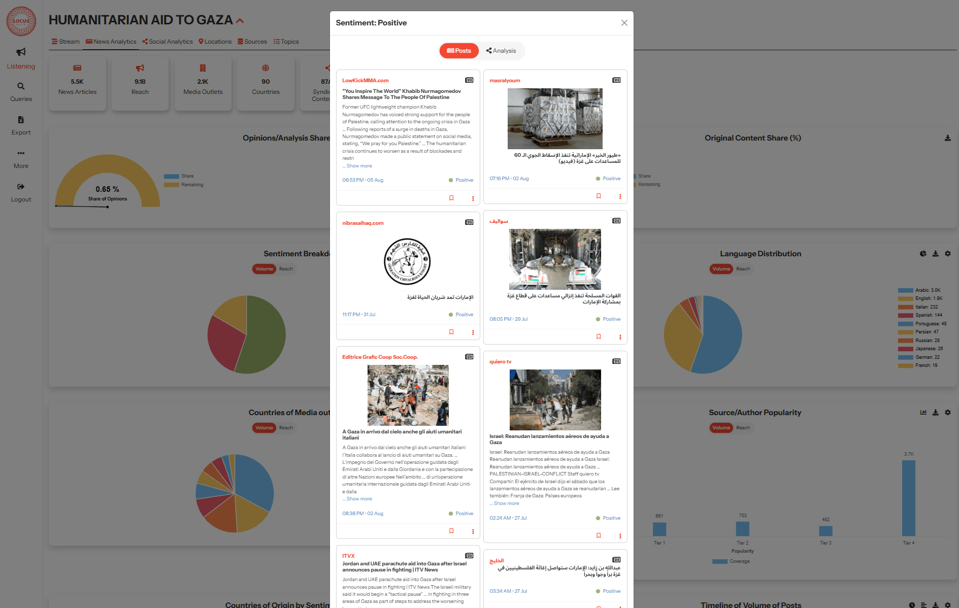Click any point on the graphs to reveal the exact articles, posts, or accounts driving activity. Access deeper analysis by day, date, language, sentiment, and platform for precise context.