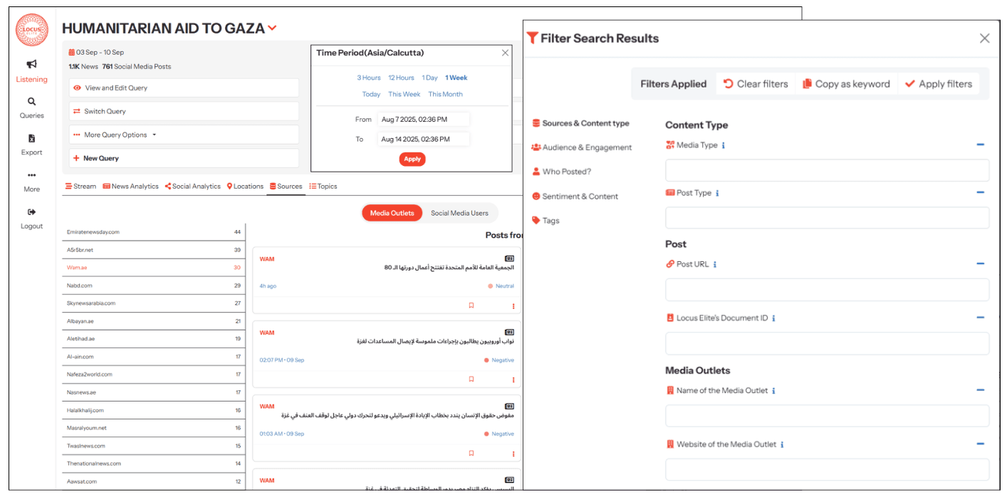 Filter search results by region, timeframe, sentiment, or source, or use the Sources and Locations tabs on the Listening page to apply built-in filters for quick, hassle-free analysis.