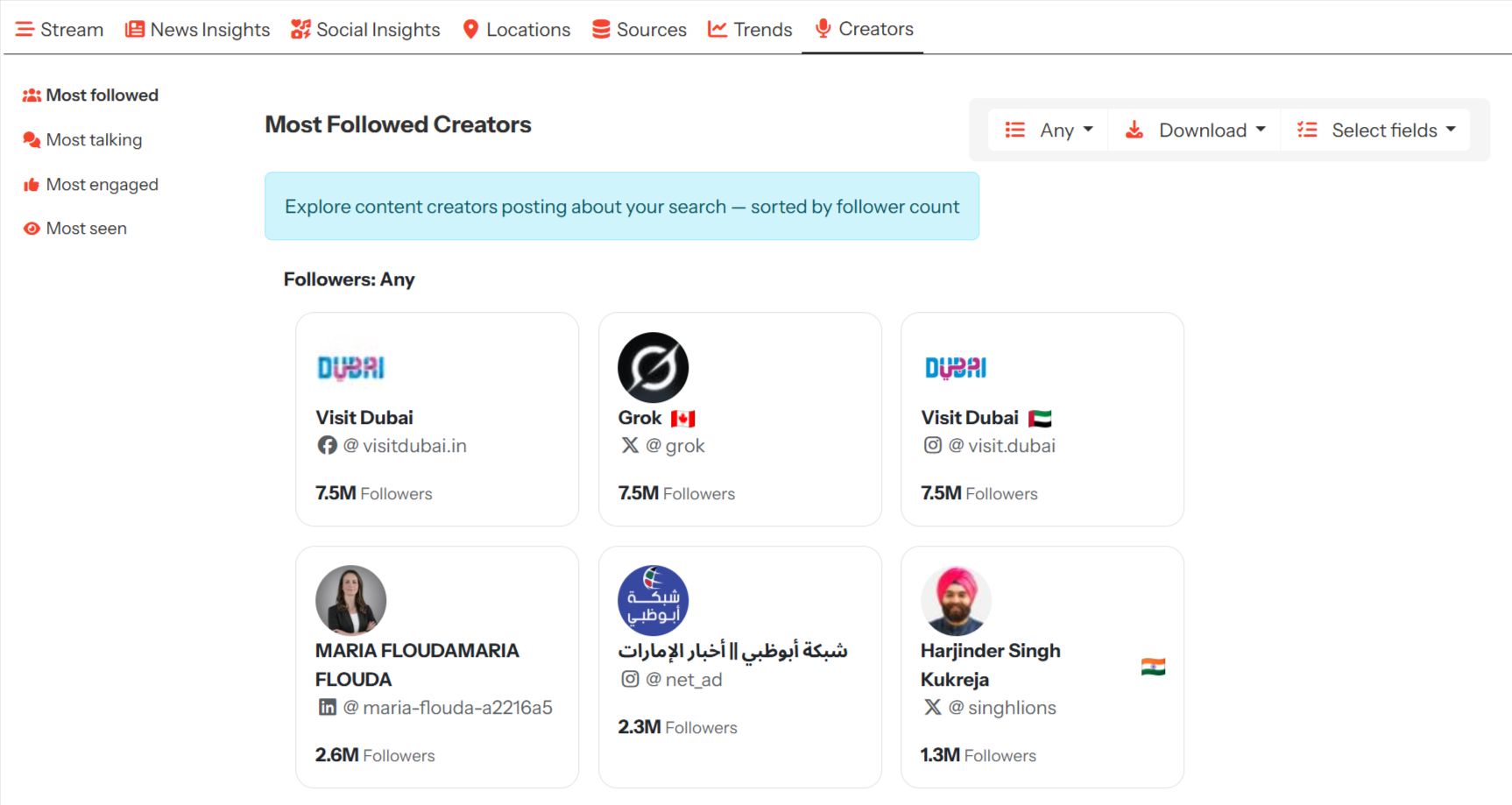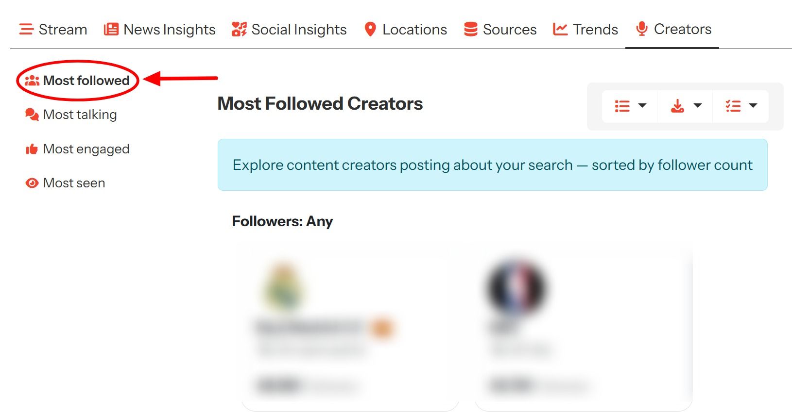 The Most Followed Creators view highlights content creators and publishers with the largest follower bases who are posting about your search. Creators in this section are sorted purely by follower count, offering an immediate view of who has the greatest potential reach.