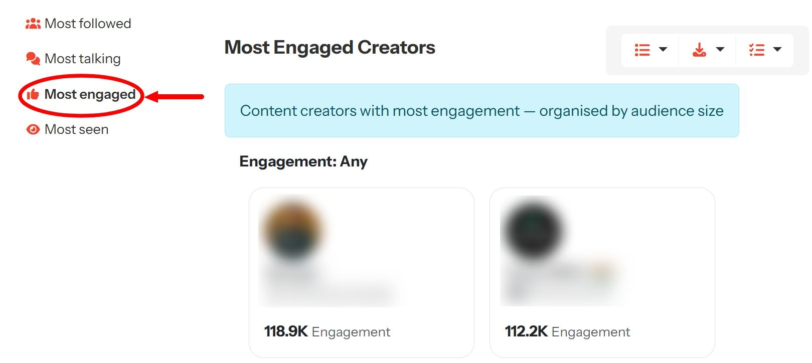 The Most Engaged Creators view reveals which creators are generating the strongest audience response. Instead of focusing on how many people could see a post, this view measures how audiences react through likes, replies, comments, and shares, with creators organised by audience size to maintain perspective.