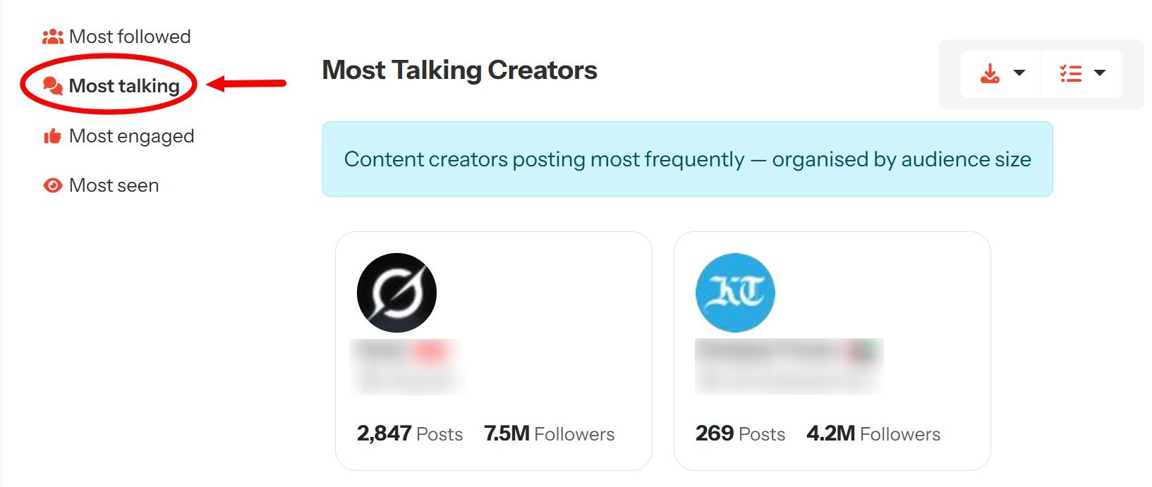 The Most Talking Creators view shifts the focus from reach to activity. It surfaces creators who are posting most frequently about your search, regardless of how many followers they have, and then organises them by audience size for context.