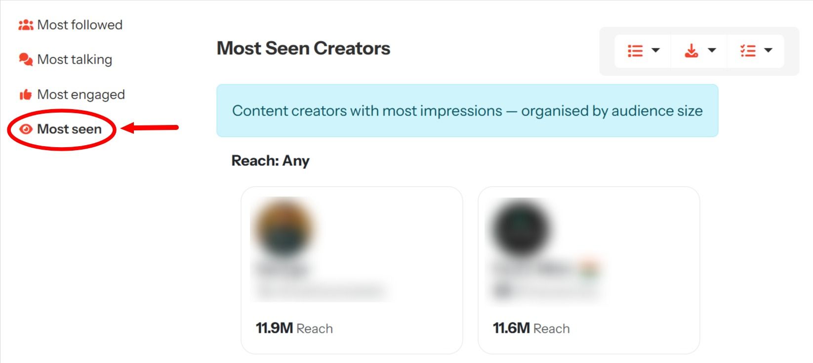 The Most Seen Creators view focuses on visibility in its most tangible form—impressions. It highlights content creators whose posts are generating the highest number of views, organised by audience size to maintain perspective. This allows teams to understand which voices are achieving the widest real-world exposure, regardless of posting frequency or follower count. A creator may post only a few times, but if their content travels widely through resharing, algorithmic amplification, or timely relevance, they will surface here. This view is critical for understanding which narratives are reaching large audiences and where attention is concentrating at scale.