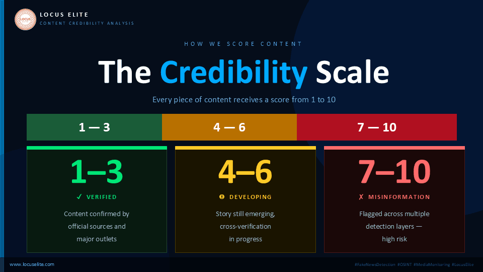 Locus Elite identifies disinformation using a multi-layered source verification and narrative validation framework designed for real-time crisis monitoring.