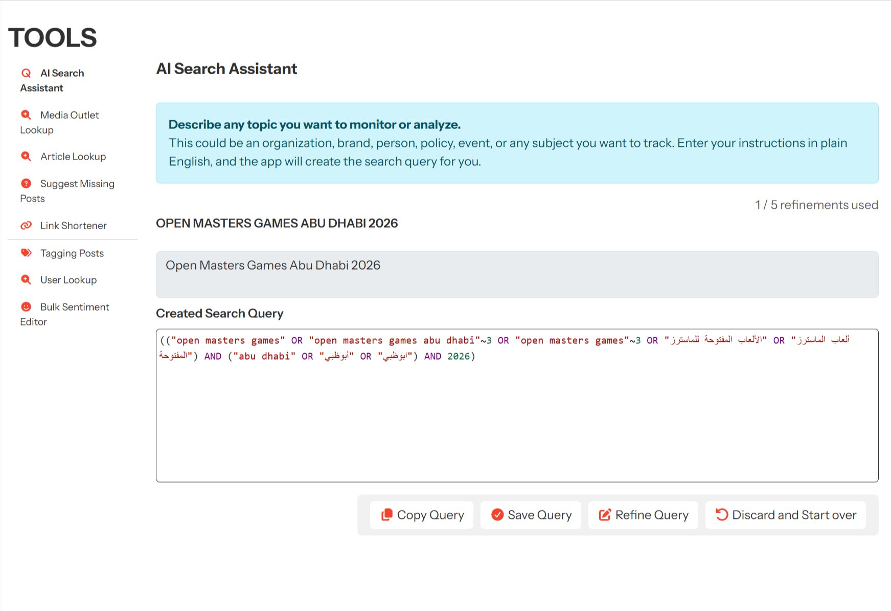 Every search is automatically structured and expanded in both English and Arabic, ensuring comprehensive multilingual coverage without manual translation.